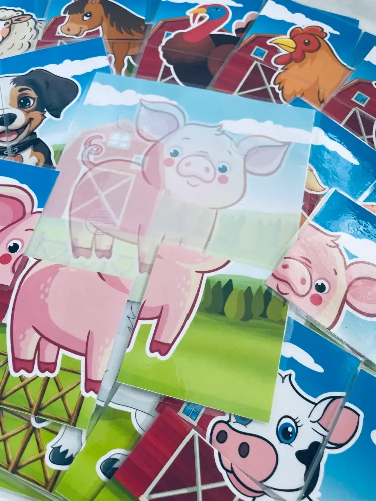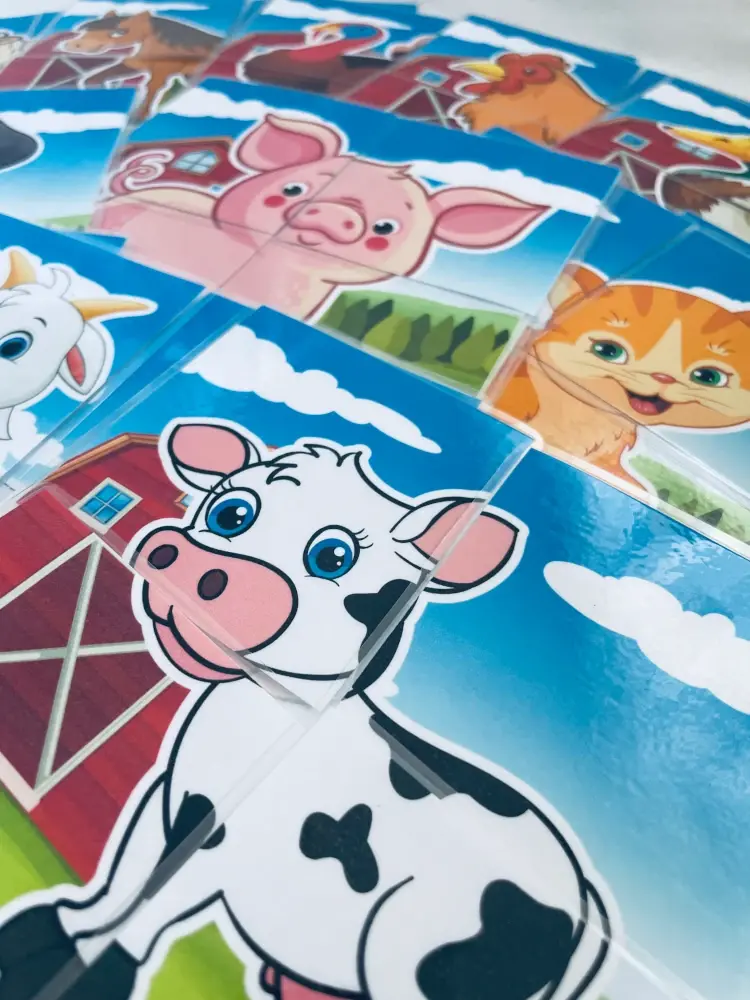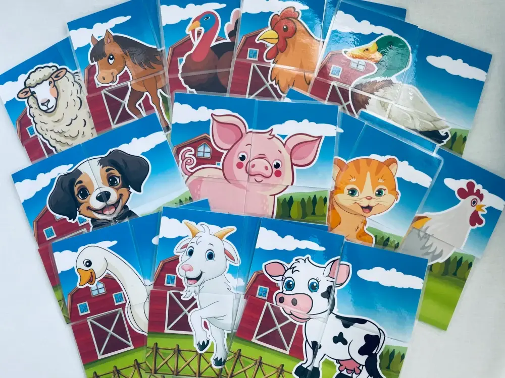 W zestawie znajduje się 12 obrazków zwierząt gospodarskich, a każdy z nich składa się z 4 dużych elementów, wygodnych do trzymania w małych rączkach. To świetna propozycja dla dzieci zaczynających przygodę z układankami — każde ułożenie obrazka daje im poczucie sukcesu i dumy.
